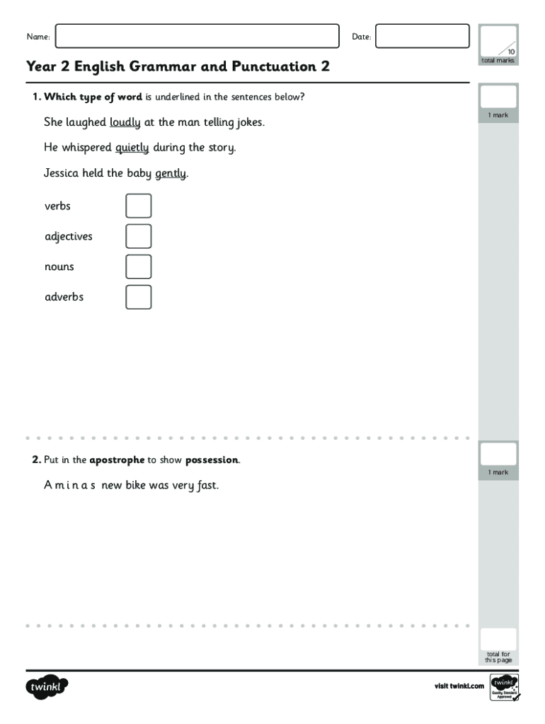 Name:Date: 10Year 2 English Grammar and Punctuation 2total marks1. Which type of word is underlined in the sentences below?She laughed loudly at the man telling jokes.1 markHe whispered quietly during