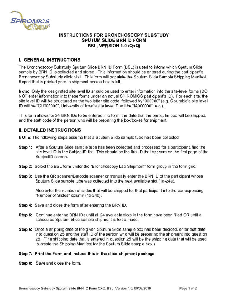 INSTRUCTIONS FOR BRONCHOSCOPY SUBSTUDY SPUTUM SLIDE BRN ID FORM BSL, VERSION 1.0 (QxQ) I. GENERAL INSTRUCTIONS The Bronchoscopy Substudy Sputum Slide BRN ID Form (BSL) is used to inform which Sputum