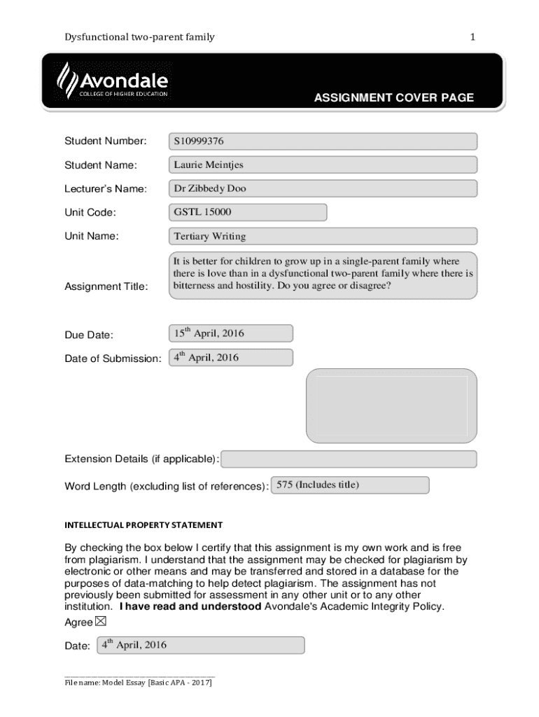 Dysfunctional twoparent family1ASSIGNMENT COVER PAGEStudent Number:S10999376Student Name:Laurie MeintjesLecturers Name:Dr Zibbedy DooUnit Code:GSTL 15000Unit Name:Tertiary WritingAssignment Title:It