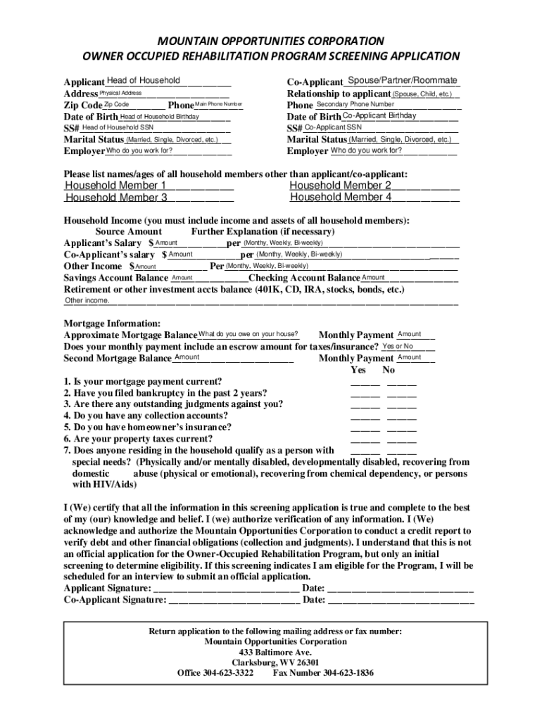 MOUNTAIN OPPORTUNITIES CORPORATION OWNER OCCUPIED REHABILITATION PROGRAM Preliminary application documentation required. Items must be returned within 10 days of the date of application. If accepted