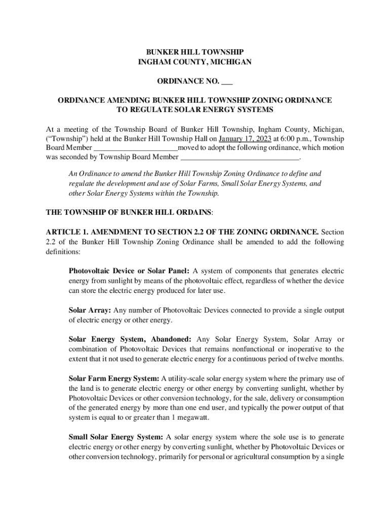 BUNKER HILL TOWNSHIP INGHAM COUNTY, MICHIGAN ORDINANCE NO. ___ ORDINANCE AMENDING BUNKER HILL TOWNSHIP ZONING ORDINANCE TO REGULATE SOLAR ENERGY SYSTEMS At a meeting of the Township Board of Bunker