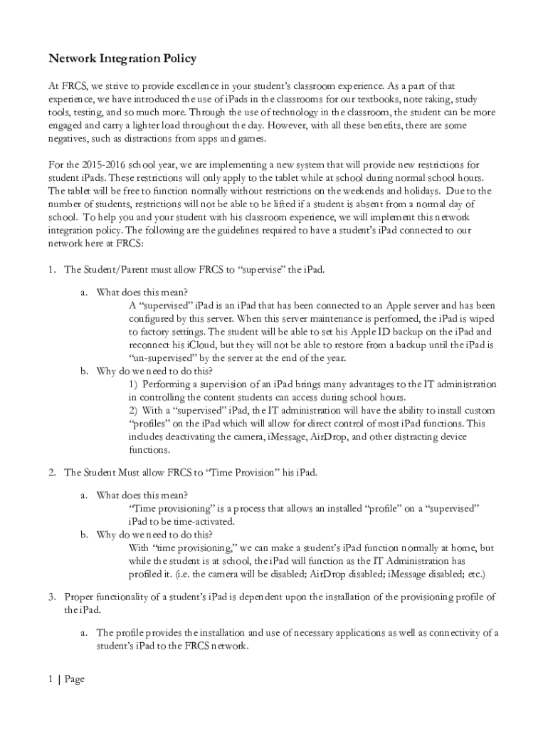 Network Integration Policy At FRCS, we strive to provide excellence in your students classroom experience. As a part of that experience, we have introduced the use of iPads in the classrooms for our