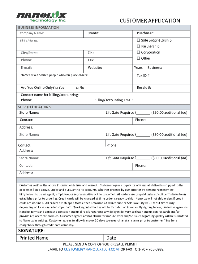 CUSTOMER APPLICATION BUSINESS INFORMATION Company Name:Owner:Purchaser: Sole proprietorship Partnership Corporation OtherBill To Address:City/State:Zip:Phone:Fax:Email:Website:Years in Business:Names