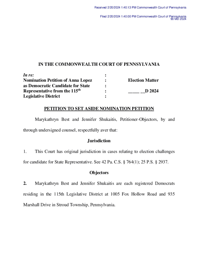 Received 2/20/2024 1:40:13 PM Commonwealth Court of Pennsylvania Filed 2/20/2024 1:40:00 PM Commonwealth Court of Pennsylvania 90 MD 2024IN THE COMMONWEALTH COURT OF PENNSYLVANIA In re: Nomination