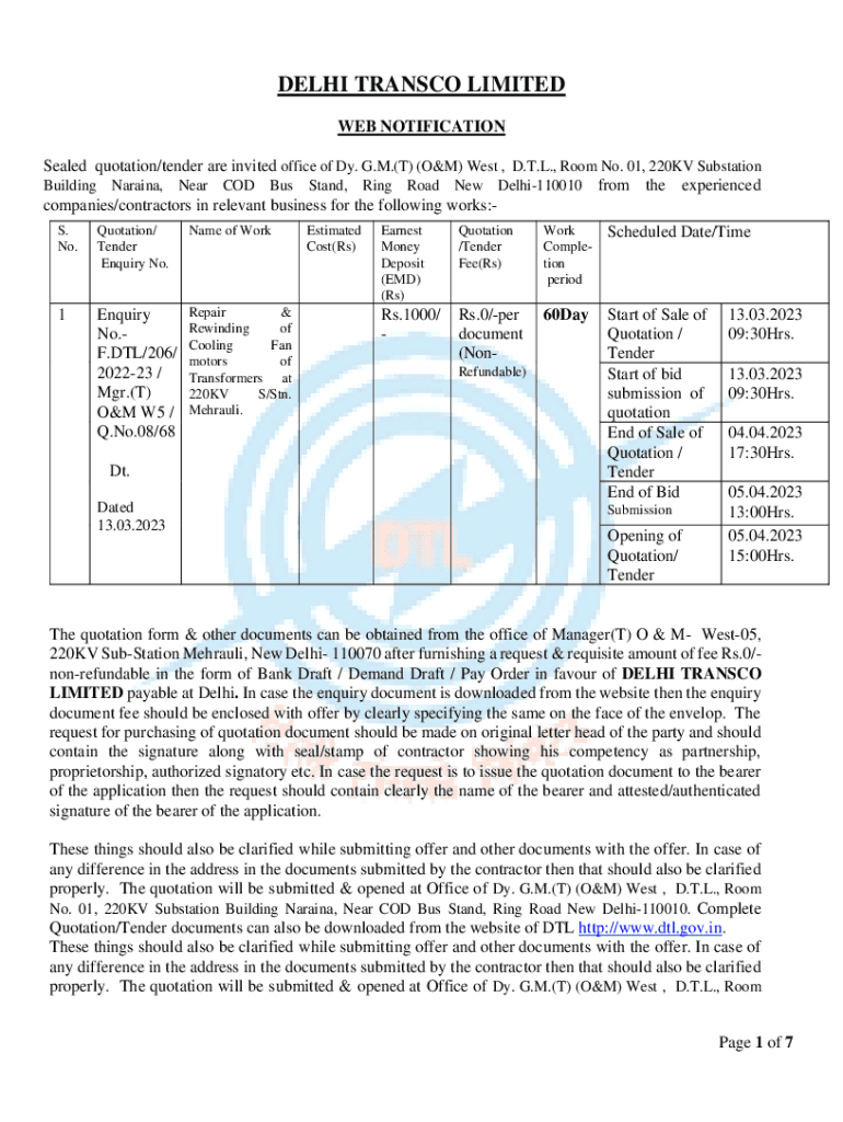DELHI TRANSCO LIMITED WEB NOTIFICATION Sealed quotation/tender are invited office of Dy. G.M.(T) (O&M) West , D.T.L., Room No. 01, 220KV Substation Building Naraina, Near COD Bus Stand, Ring Road
