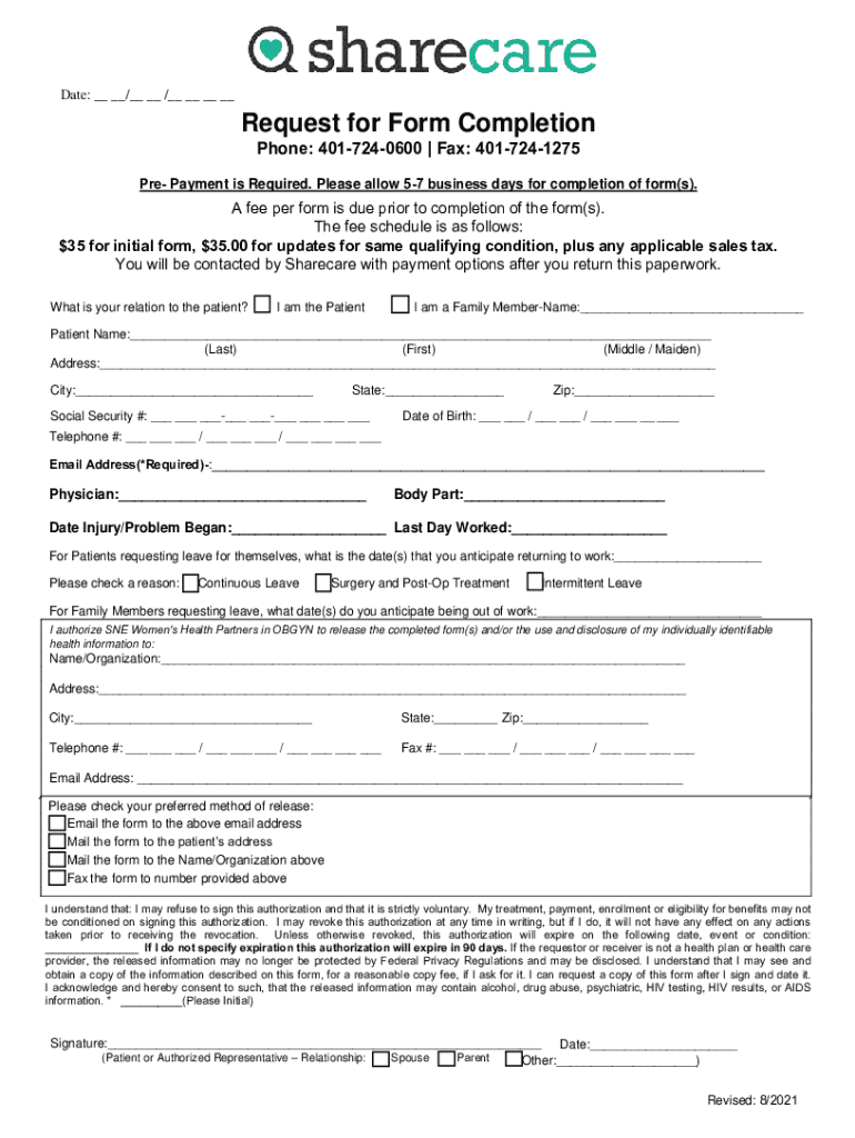 Date: __ __/__ __ /__ __ __ __Request for Form Completion Phone: 4017240600 | Fax: 4017241275Pre Payment is Required. Please allow 57 business days for completion of form(s).A fee per form is due