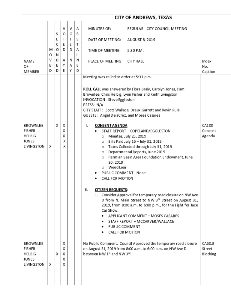 CITY OF ANDREWS, TEXASNAME OF MEMBERS E C M O O N V D E E D DV O T E D A Y EV O T E DA B S T A I N N A E Y DMINUTES OF:REGULAR CITY COUNCIL MEETINGDATE OF MEETING:AUGUST 8, 2019TIME OF MEETING:5:30