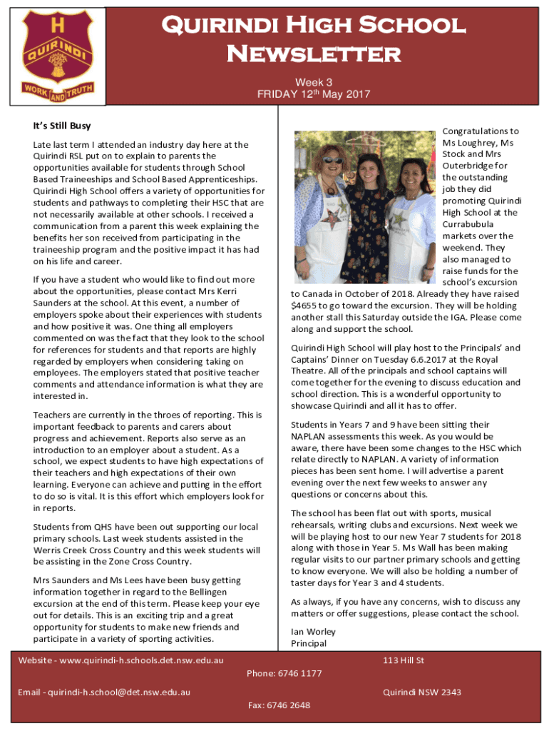 Quirindi High School Newsletter Week 3 FRIDAY 12th May 2017 Its Still Busy Late last term I attended an industry day here at the Quirindi RSL put on to explain to parents the opportunities available