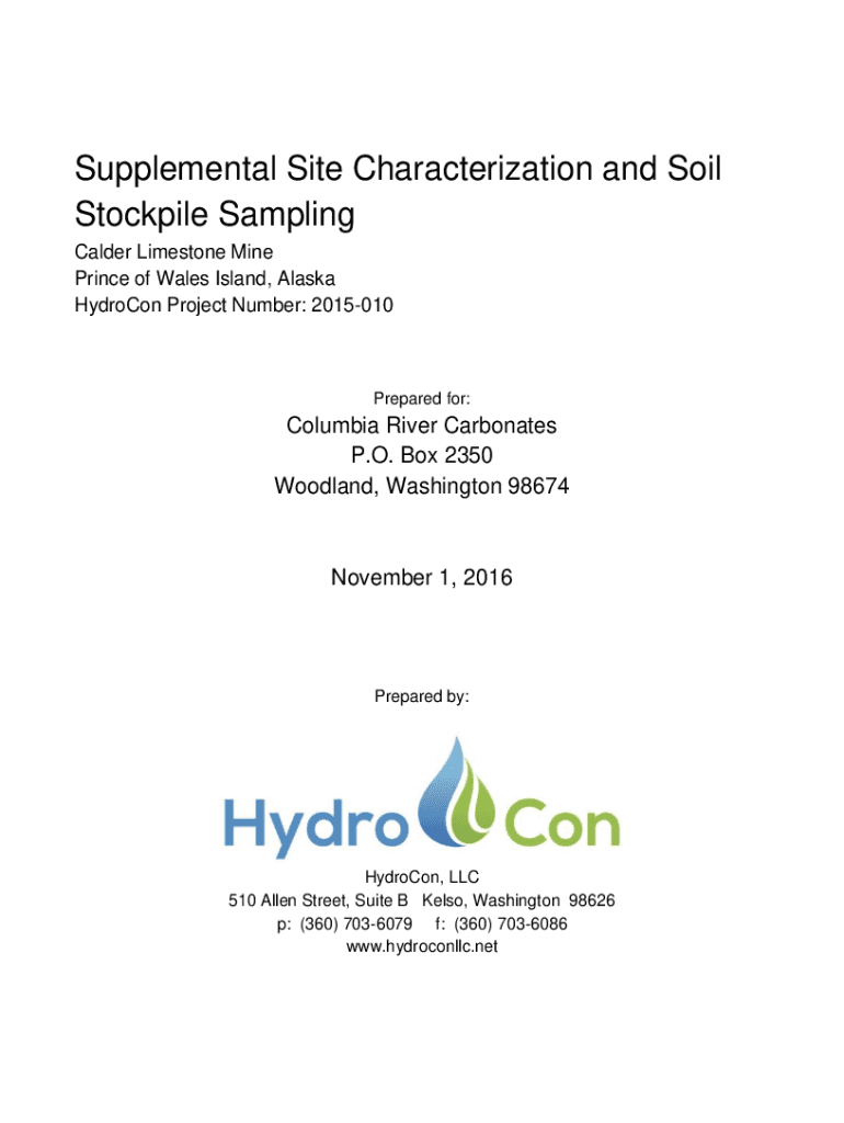Supplemental Site Characterization and Soil Stockpile Sampling Calder Limestone Mine Prince of Wales Island, Alaska HydroCon Project Number: 2015010Prepared for:Columbia River Carbonates P.O. Box