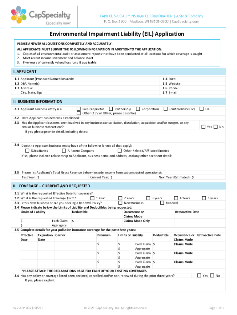 CAPITOL SPECIALTY INSURANCE CORPORATION | A Stock Company P. O. Box 5900 | Madison, WI 537050900 | CapSpecialty.comEnvironmental Impairment Liability (EIL) Application PLEASE ANSWER ALL QUESTIONS