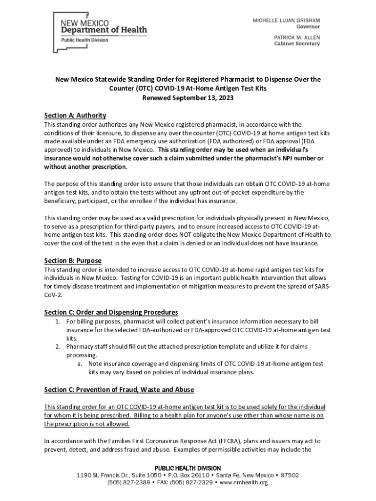 New Mexico Statewide Standing Order for Registered Pharmacist to Dispense Over the Counter (OTC) COVID19 AtHome Antigen Test Kits Renewed September 13, 2023 Section A: Authority This standing order