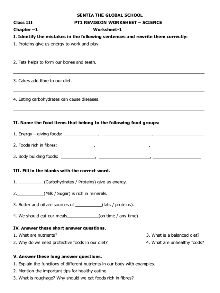 SENT IA THE GLOBAL SCHOOL Class III Chapter 1PT1 REVISION WORKSHEET SCIENCE Worksheet1I. Identify the mistakes in the following sentences and rewrite them correctly: 1. Proteins give us energy to
