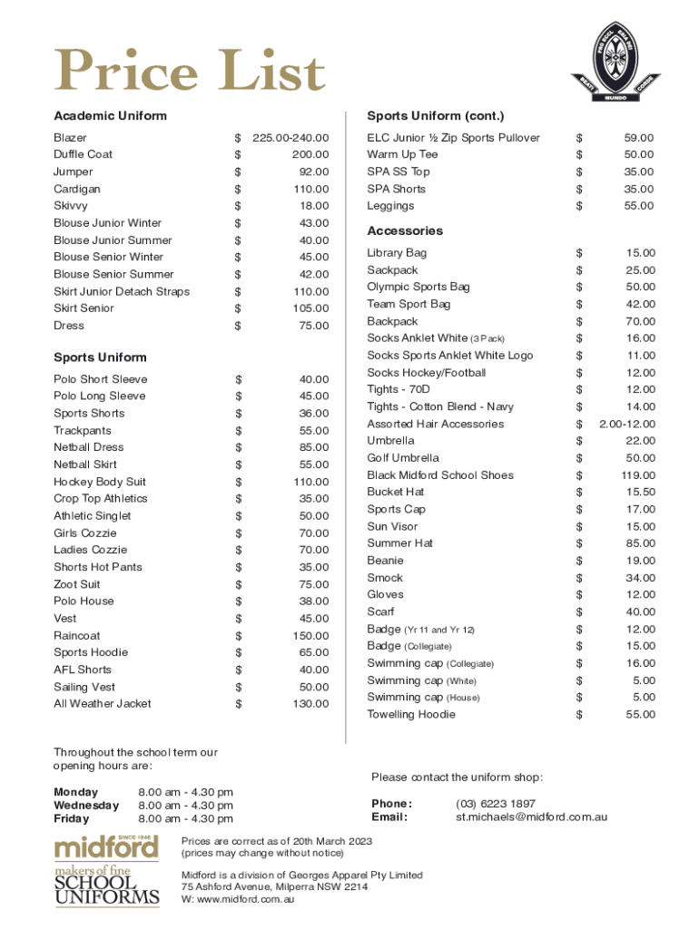 Price List Academic UniformSports Uniform (cont.)Blazer$ 225.00240.00ELC Junior Zip Sports Pullover$59.00Jumper$SPA SS Top$35.00Duffle Coat Cardigan Skivvy$200.00$110.00$43.00$Blouse Junior WinterBlouse