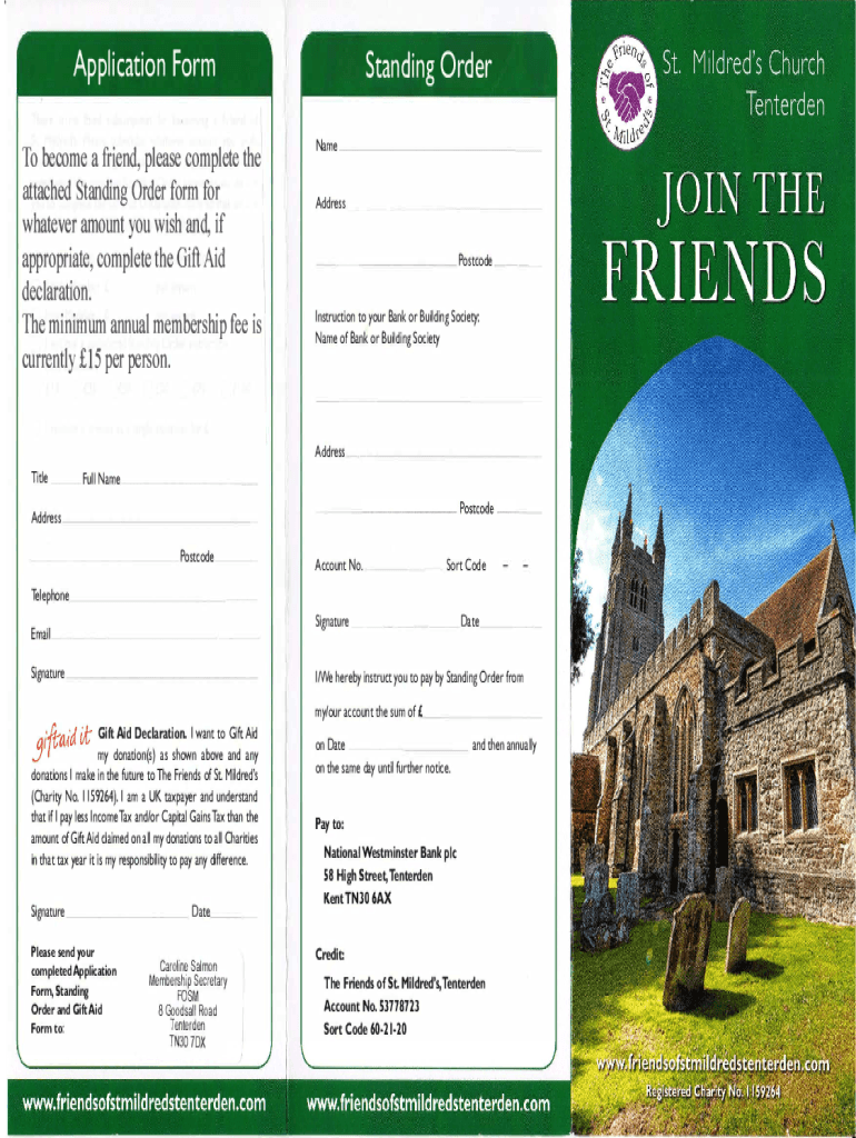 Application FormStanding OrderTo become a friend, please complete the attached Standing Order form for whatever amount you wish and, if appropriate, complete the Gift Aid declaration. The minimum