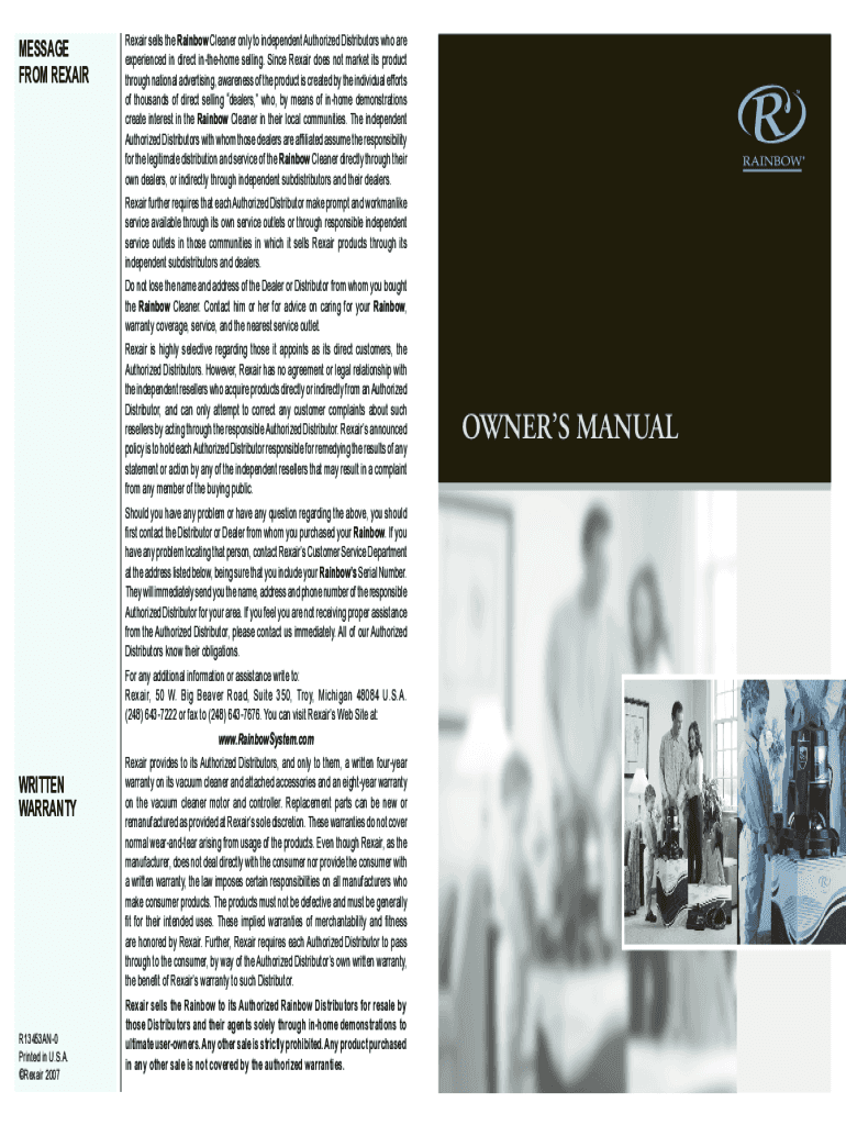 MESSAGE FROM REXAIRWRITTEN WARRANTYR13453AN0 Printed in U.S.A. Rexair 2007Rexair sells the Rainbow Cleaner only to independent Authorized Distributors who are experienced in direct inthehome selling.