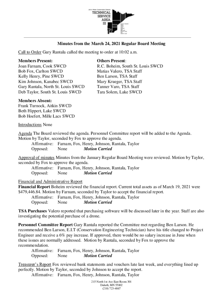 Minutes from the March 24, 2021 Regular Board Meeting Call to Order Gary Rantala called the meeting to order at 10:02 a.m. Members Present: Joan Farnam, Cook SWCD Bob Fox, Carlton SWCD Kelly Henry,