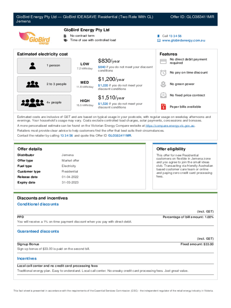 GloBird Energy Pty Ltd GloBird IDEASAVE Residential (Two Rate With CL) JemenaOffer ID: GLO383411MRGloBird Energy Pty Ltd No contract term Time of use with controlled loadEstimated electricity costCall