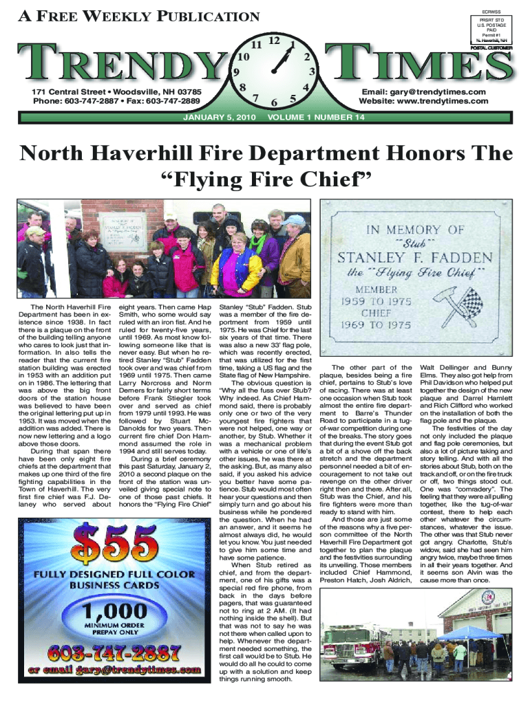 A Free Weekly PubliCATioNECRWSS11 12 1171 Central Street Woodsville, NH 03785 Phone: 6037472887 Fax: 603747288910 9 87 6JANUARY 5, 20105PRSRT STD U.S. POSTAGE PAID Permit #1 N. Haverhill, NH POSTAL