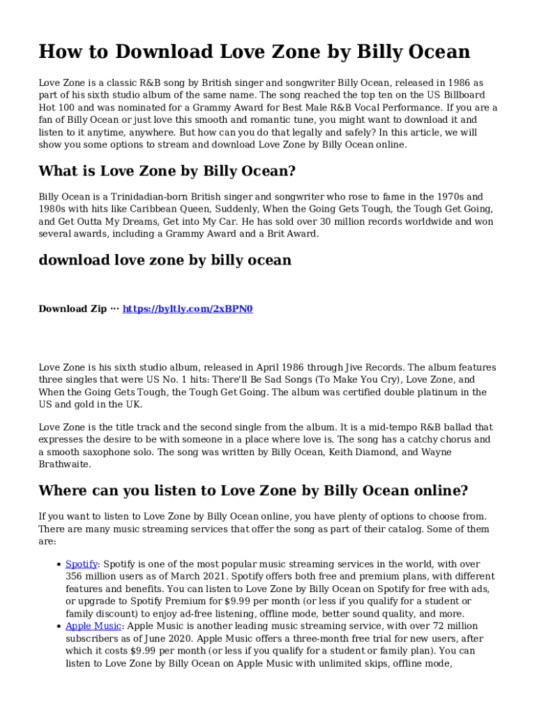 How to Download Love Zone by Billy Ocean Love Zone is a classic R&B song by British singer and songwriter Billy Ocean, released in 1986 as part of his sixth studio album of the same name. The song