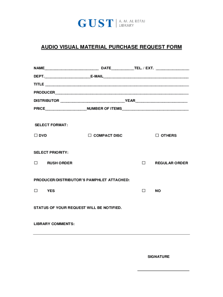 AUDIO VISUAL MATERIAL PURCHASE REQUEST FORMNAME___ DATE___TEL. / EXT. ___ DEPT.___EMAIL___ TITLE ___ PRODUCER___ DISTRIBUTOR ___YEAR___ PRICE___NUMBER OF ITEMS___SELECT FORMAT: DVD COMPACT DISC OTHERSSELECT