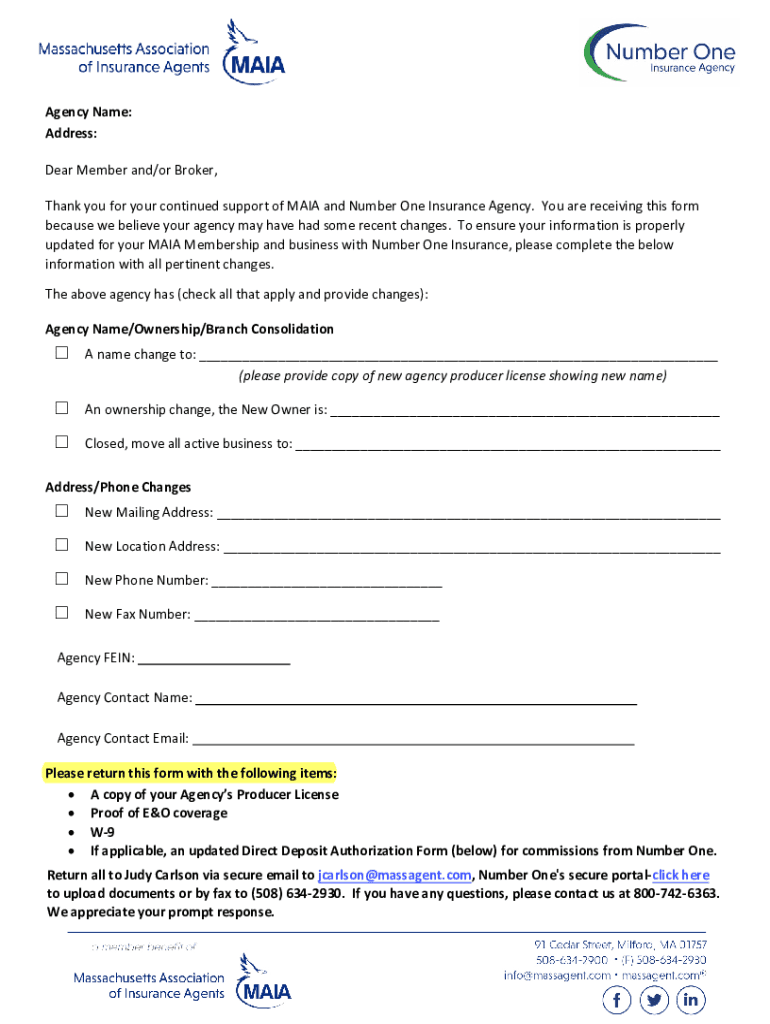 Agency Name: Address: Dear Member and/or Broker, Thank you for your continued support of MAIA and Number One Insurance Agency. You are receiving this form because we believe your agency may have had