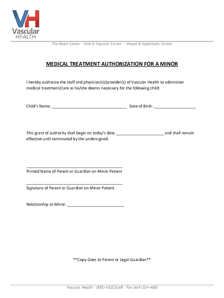 MEDICAL TREATMENT AUTHORIZATION FOR A MINOR I hereby authorize the staff and physician(s)/provider(s) of Vascular Health to administer medical treatment/care as he/she deems necessary for the following