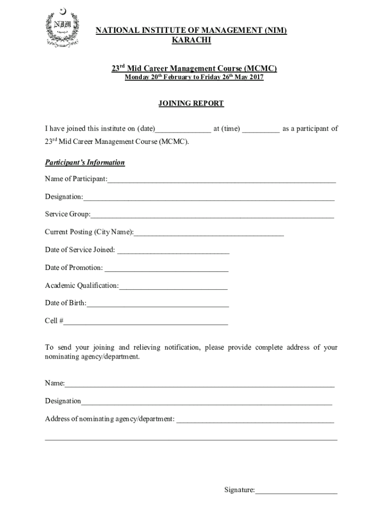 NATIONAL INSTITUTE OF MANAGEMENT (NIM) KARACHI 23rd Mid Career Management Course (MCMC) Monday 20th February to Friday 26th May 2017JOINING REPORT I have joined this institute on (date)___ at (time)