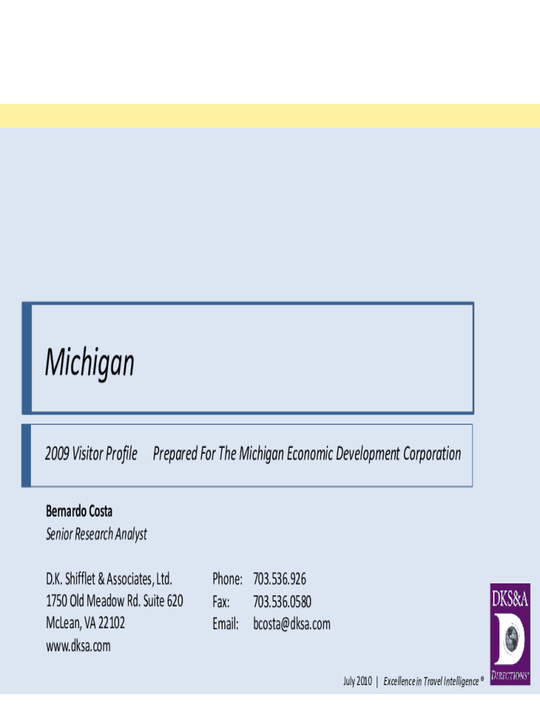 Michigan 2009 Visitor ProfilePrepared For The Michigan Economic Development CorporationBernardo Costa Senior Research AnalystD.K. Shifflet & Associates, Ltd. 1750 Old Meadow Rd. Suite 620 McLean,