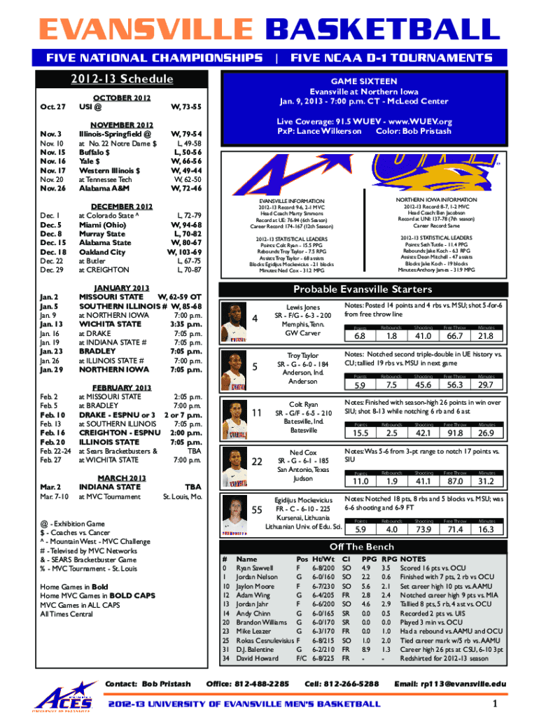EVANSVILLE BASKETBALL FIVE NATIONAL CHAMPIONSHIPS201213 Schedule Oct. 27OCTOBER 2012 USI @W, 7355Nov. 3Nov. 10Nov. 15Nov. 16Nov. 17Nov. 20Nov. 26NOVEMBER 2012 IllinoisSpringfield @at No. 22 Notre