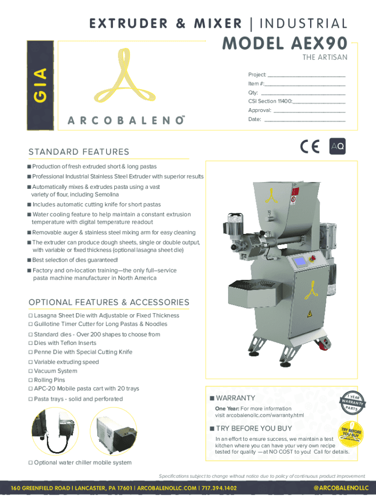 EXTRUDER & MIXER |INDUSTRIALM O D E L A E X 90 GIATHE ARTISANProject: ___ Item #:___ Qty: ___ CSI Section 11400:___ Approval: ___ Date: ___STAN DAR D F EAT U RE S Production of fresh extruded short