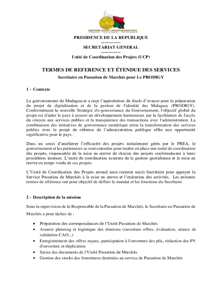 PRESIDENCE DE LA REPUBLIQUE SECRETARIAT GENERAL Unit de Coordination des Projets (UCP)TERMES DE REFERENCE ET TENDUE DES SERVICES Secrtaire en Passation de Marchs pour Le PRODIGY 1 Contexte Le gouvernement