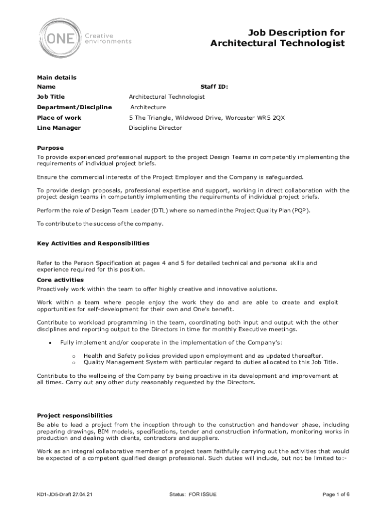 Job Description for Architectural TechnologistMain details NameStaff ID:Job TitleArchitectural TechnologistDepartment/DisciplineArchitecturePlace of work5 The Triangle, Wildwood Drive, Worcester WR5