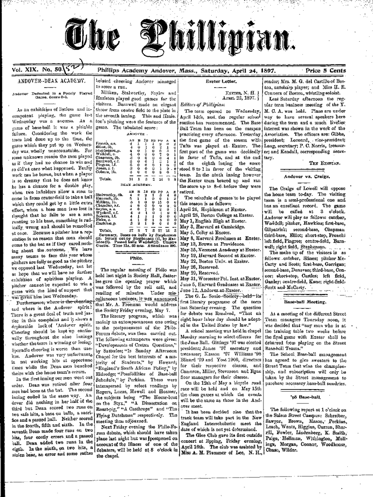 .mmryIkVol. XIX. No. 50.\'/Phillips Academy Andover,Mass., Saturday, Aprl 24, 1897.ANDOVERDEAX ACADEMY, Andover Defeated in a Poorly PlayedGame. score 81. As an exhibition of listless a incompetent