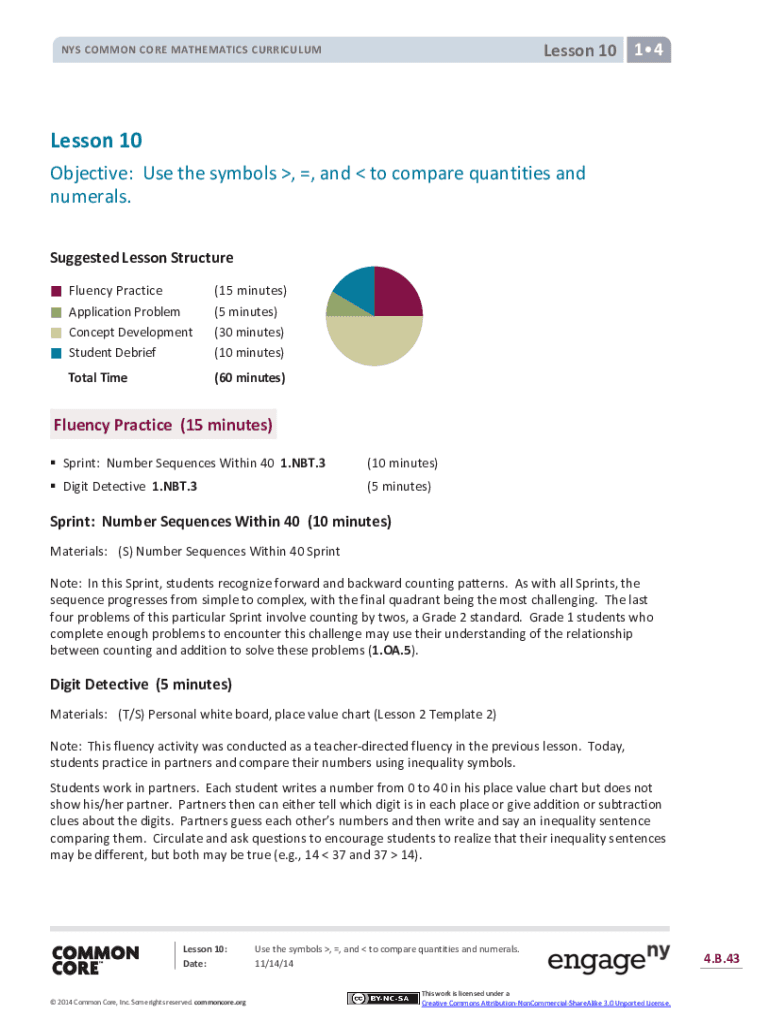 Lesson 10 14NYS COMMON CORE MATHEMATICS CURRICULUMLesson 10 Objective: Use the symbols , , and to compare quantities and numerals. Suggested Lesson Structure Fluency Practice Application Problem Concept