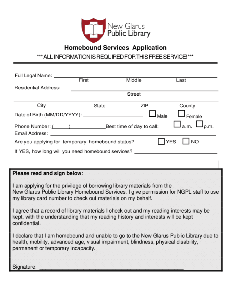 Homebound Services Application *** ALL INFORMATION IS REQUIRED FOR THIS FREE SERVICE! *** Full Legal Name: FirstMiddleLastResidential Address: Street CityZIPStateDate of Birth (MM/DD/YYYY): Phone