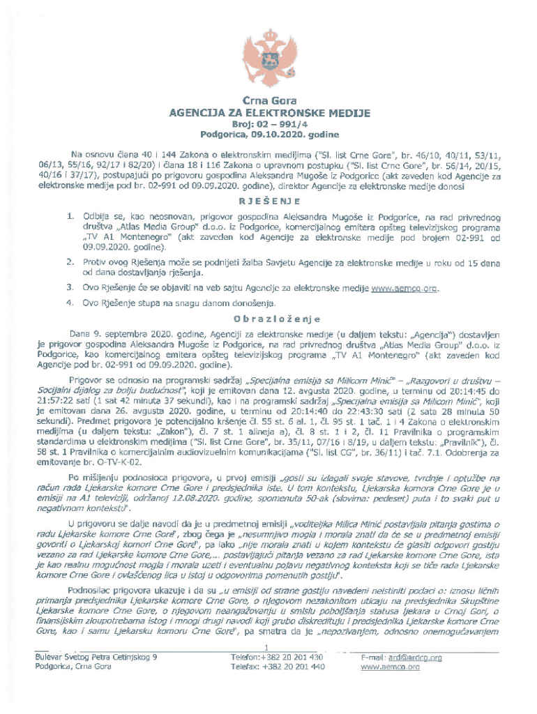 Crna Gora AGENCIJA ZA ELEKTRONSKE MEDIJE Broj: 02 991/4 Podgorica, 09.10.2020. godine Na osnovu lana 40 i 144 Zakona o elektronskim medijima (\"SI. list Crne Gore\", br. 46/10, 40/11, 53/11, 06/13,