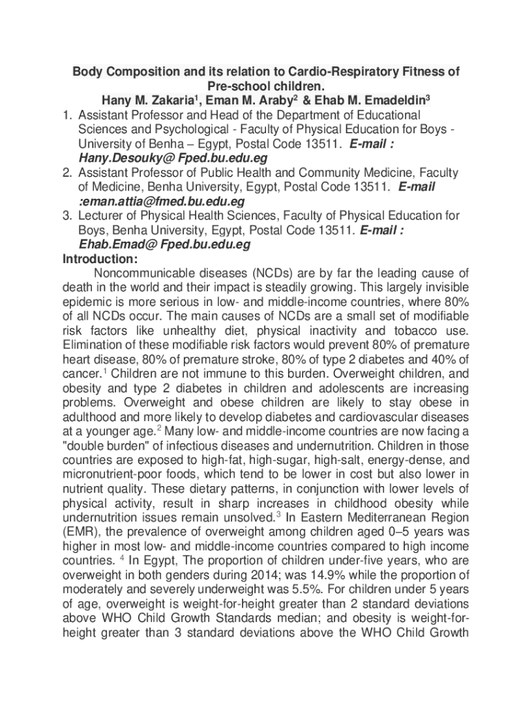 Body Composition and its relation to CardioRespiratory Fitness of Preschool children. 1 Any M. Bavaria, Man M. Araby2 & Rehab M. Emadeldin3 1. Assistant Professor and Head of the Department of Educational