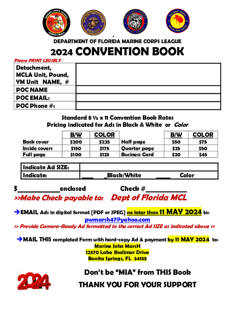 DEPARTMENT OF FLORIDA MARINE CORPS LEAGUE2024 CONVENTION Bookplate PRINT LEGIBLYDetachment,