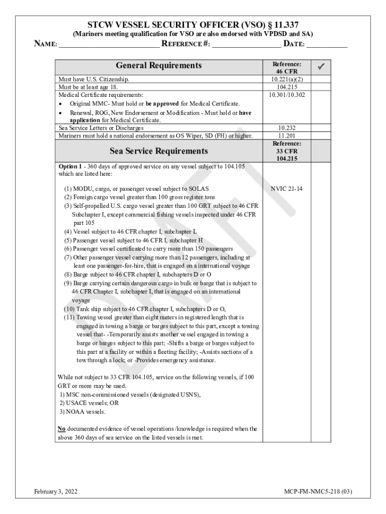STCW VESSEL SECURITY OFFICER (VSO) 11.337(Mariners meeting qualification for VSO are also endorsed with VPDSD and SA)NAME: ___ REFERENCE #: ___ DATE: ___ General Requirements Must have U.S. Citizenship.