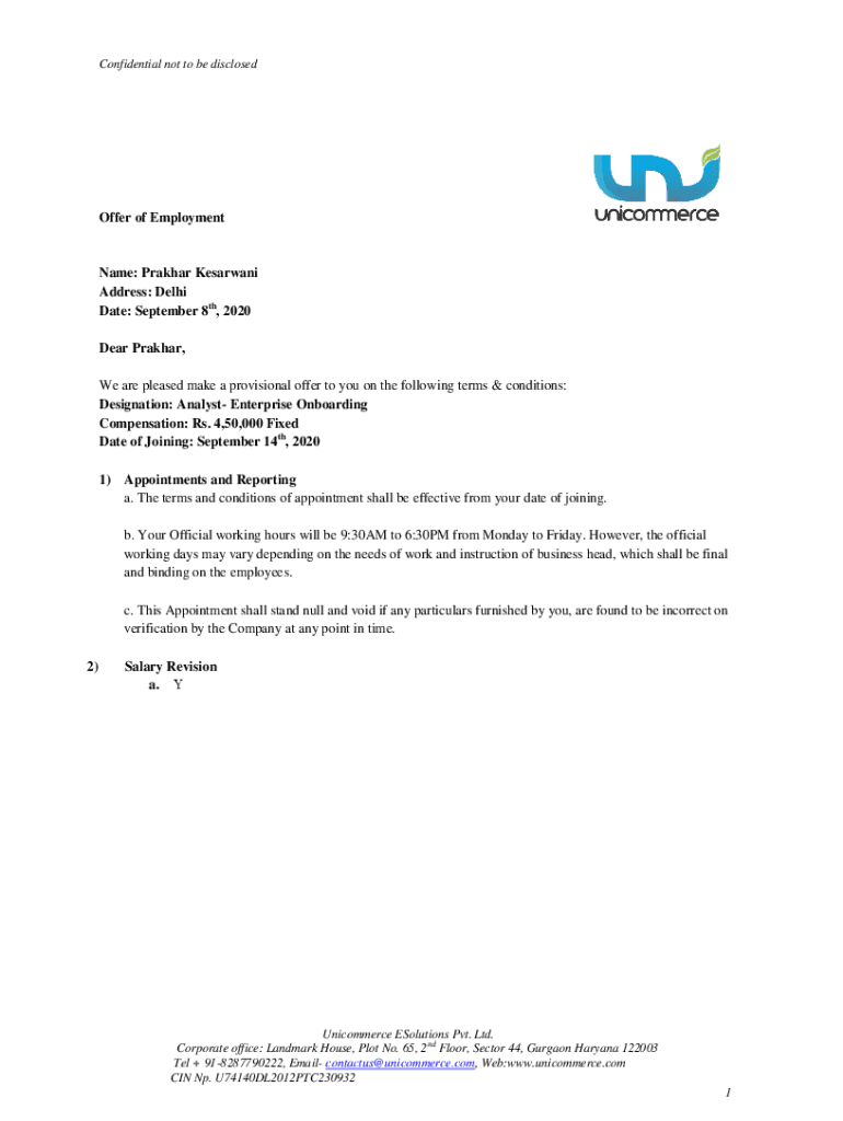 Confidential not to be disclosedOffer of EmploymentName: Prakhar Kesarwani Address: Delhi Date: September 8th, 2020 Dear Prakhar, We are pleased make a provisional offer to you on the following terms