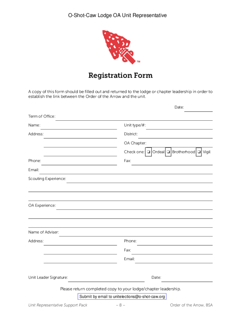 OShotCaw Lodge OA Unit RepresentativeRegistration Form A copy of this form should be filled out and returned to the lodge or chapter leadership in order to establish the link between the Order of