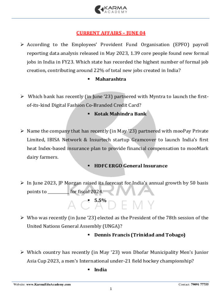 CURRENT AFFAIRS JUNE 04 According to the Employees Provident Fund Organisation (EPFO) payroll reporting data analysis released in May 2023, 1.39 core people found new formal jobs in India in FY23.