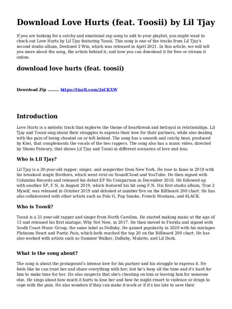 Download Love Hurts (feat. Tonsil) by Lil Tjay If you are looking for a catchy and emotional rap song to add to your playlist, you might want to check out Love Hurts by Lil Tjay featuring Tonsil.