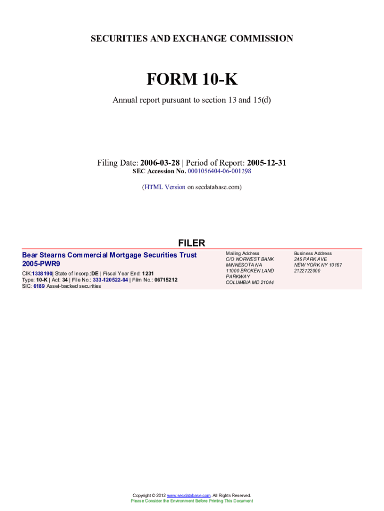 Get the free Bear Stearns Commercial Mortgage Securities Trust 2005-PWR9 (Form. Accession Number