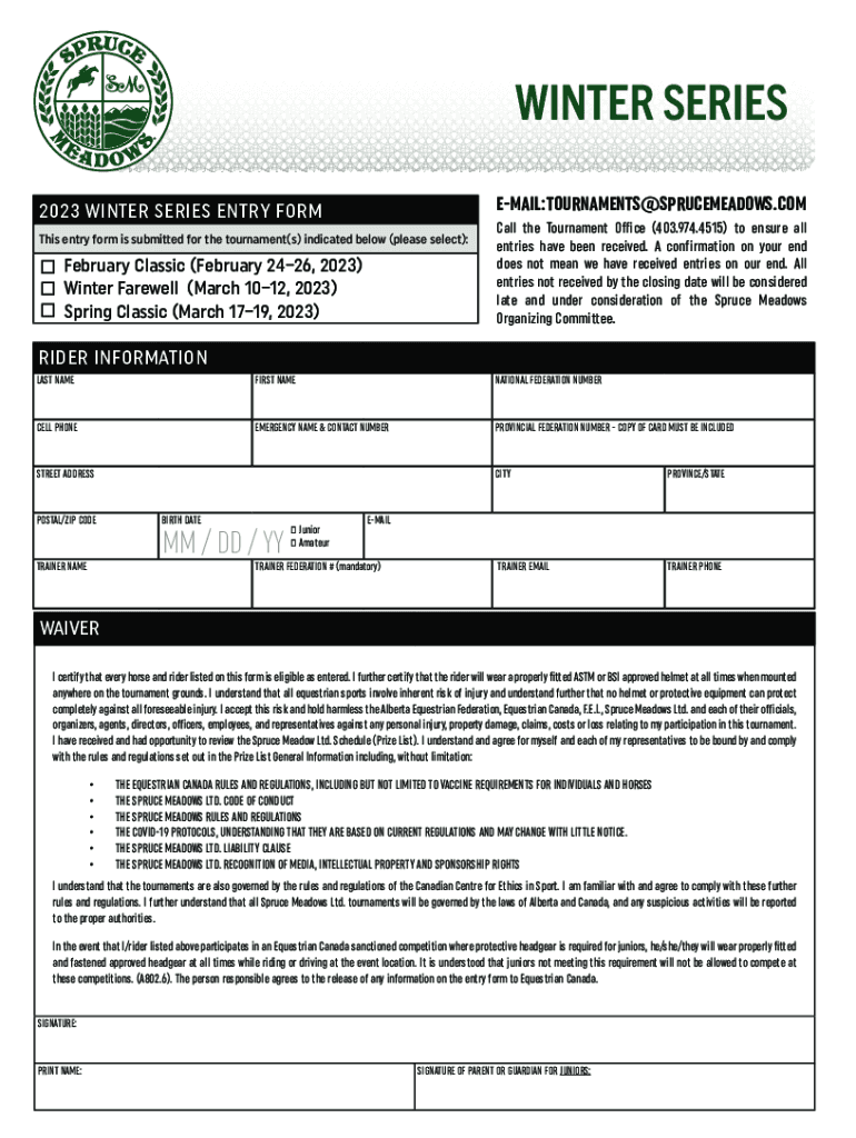 WINTER SERIES EMAIL: TOURNAMENTS@SPRUCEMEADOWS.COM2023 WINTER SERIES ENTRY FORM This entry form is submitted for the tournament(s) indicated below (please select):February Classic (February 2426,