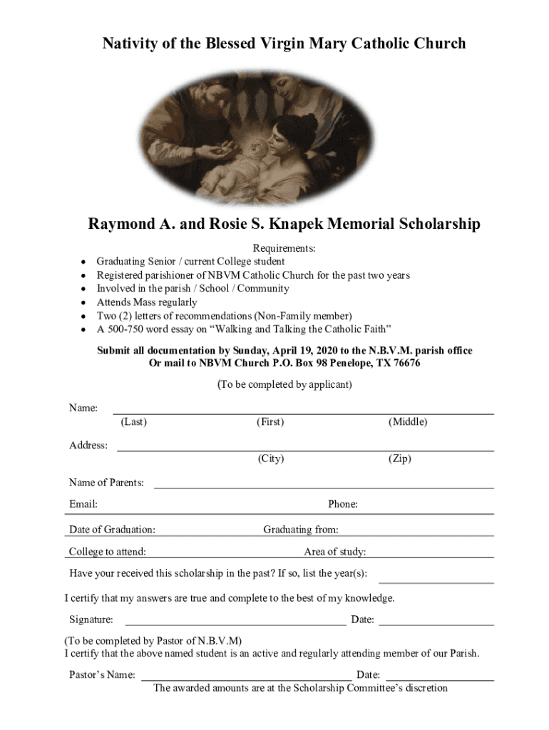 Nativity of the Blessed Virgin Mary Catholic ChurchRaymond A. and Rosie S. Knapek Memorial Scholarship Requirements: Graduating Senior / current College student Registered parishioner of NBVM Catholic