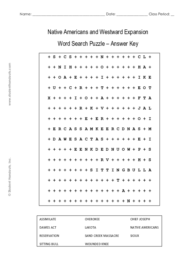 Name: ___ Date: ___ Class Period: __Native Americans and Westward Expansion Word Search Puzzle Answer Key www.studenthandouts.com+ S + C S + + + + + N + + + + + + C L + + + N I H + + + + + O + + +