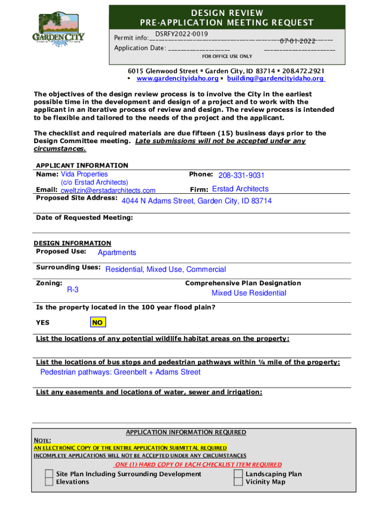 DESIGN REVIEW PREAPPLICATION MEETING REQUEST DSRFY20220019 Permit info:___ 07012022 Application Date: ___ ___ FOR OFFICE USE ONLY6015 Glenwood Street Garden City, ID 83714 208.472.2921 www.gardencityidaho.org
