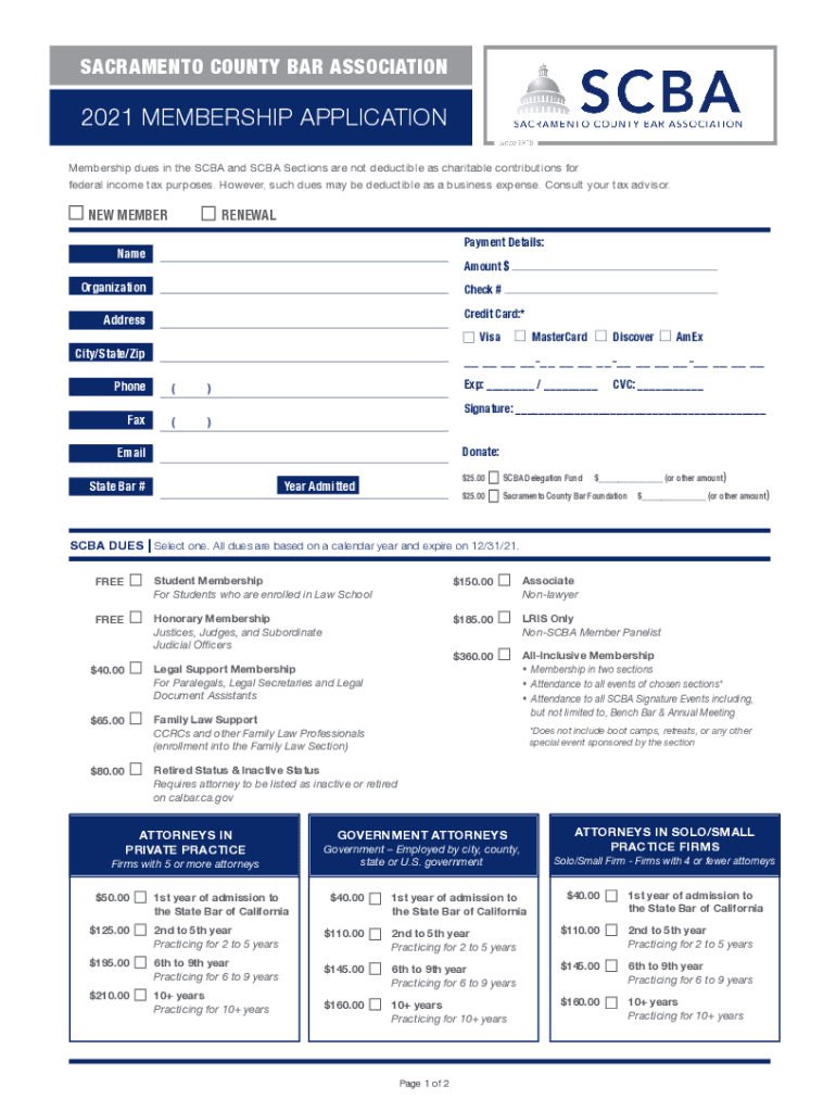 SACRAMENTO COUNTY BAR ASSOCIATION2021 MEMBERSHIP APPLICATION Membership dues in the SCBA and SCBA Sections are not deductible as charitable contributions for federal income tax purposes. However,
