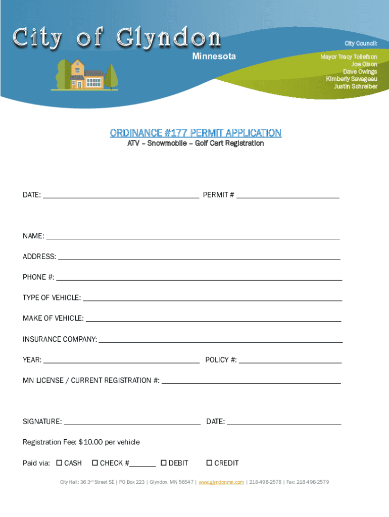City of Glyndon MinnesotaCity Council: Mayor Tracy Tollefson Joe Olson Dave Owings Kimberly Savageau Justin SchreiberORDINANCE #177 PERMIT APPLICATION ATV Snowmobile Golf Cart RegistrationDATE: ___
